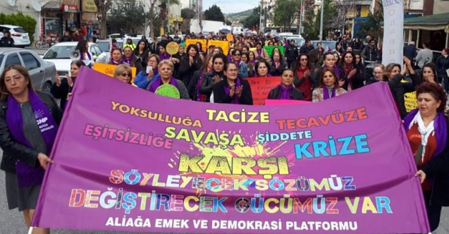 "Bugün gerici zihniyetin toplumsal dizaynının önündeki tek engel olarak gördüğü kadınları karanlık dehlizlere mahkum etmek isteyen anlayışı geldiği karanlıklara gönderme vaktidir. Daha önce olduğu gibi bugün de Aliağalı Kadınlar olarak, yitirdiğimiz tüm kız kardeşlerimizin adına ve onların arasına bir yenimiz daha eklenmesin diye 25 Kasım Kadına Şiddete Karşı Mücadele gününde bütün kadınları sokağa, taleplerimizi haykırmaya, haklarımıza sahip çıkmaya çağırıyoruz"