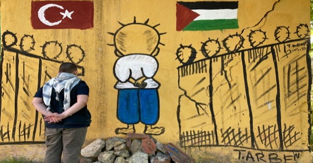 Filistinli çocukların yanında olduğunu göstermek isteyen 11 yaşındaki karikatürist Taha Arben, Filistinli çizer Naci El Ali’nin hayat verdiği ve Filistin direnişinin sembolü olan “Hanzala” karikatürünü Bergama ilçesi Araplıova Mahallesi'nde duvarlara çizdi.