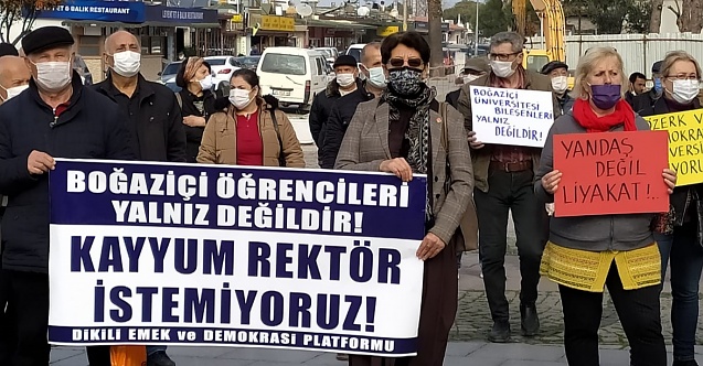Basın açıklaması ise Dikili Eğitim-Sen Kadın Sekreteri Ezgi Yalçınkaya tarafından okundu. Açıklamada; “Bilindiği üzere, Cumhurbaşkanı Erdoğan Boğaziçi Üniversitesi’ne AKP’ye sadakati ile bilinen eski bir AKP milletvekili aday adayını rektör olarak atadı. Söz konusu atamayı kayyum olarak niteleyen Boğaziçi Üniversitesi bileşenlerinin demokratik tepkisine polisin sert müdahalesi gecikmedi. Atanan Rektör Melih Bulu ve polisin ilk icraatı ise kampüse girmek isteyen öğrencileri engellemek amacıyla (!) kampüs kapılarına kelepçe vurmak oldu” denildi.