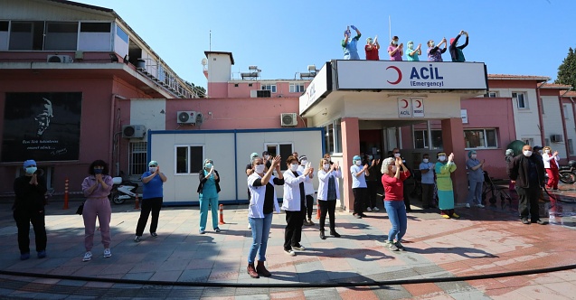 Devlet hastanesi önünde Efes Selçuk Belediye Bandosu’nu karşılayan sağlıkçılar, bando takımının “Çav Bella” performansına eşlik ettiler.