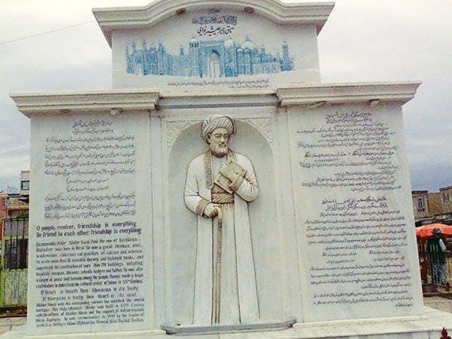 Fotoğraf 9. Ali Şir Nevai’nin Afganistan Mezar-ı Şerif kentinde bulunan Anıt Heykeli. Bu Anıt önünde bulunan Ali Şir Nevai Heykelini 17 Şubat 2023’de, “cehalet” yıkmıştır. Yazılar; Fars, Özbek Türkçesi ve İngilizce dilindedir.