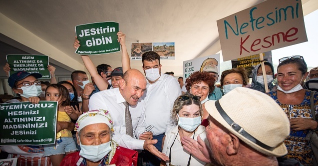 “Susma haykır, JES'e hayır”, “Üzüm, incir, zeytin geleceğimiz”, “Burası jeotermal arsası değil, keçilerin merası”, “Zeytinime dokunma” yazılı dövizlerin taşındığı protestoda Başkan Tunç Soyer, yerel yöneticilerin asli işinin, görev yaptıkları toprakları ve onun kültürünü korumak olduğunu belirtti. Soyer, “İlk işimiz, bu toprakları korumaktır. Çünkü bizim üstlendiğimiz görevler, nöbet görevleridir. Biz nöbetçiyiz. Biz görev süremizin sonunda gideceğiz ama görev süresi içerisinde bize emanet edilen, atalarımızın binlerce yıl boyunca biriktirdikleri değerleri, korumazsak hangi görevi yapmış oluruz? Hangi işi yapmış oluruz? Aslolan, bizden önce de var olup, atalarımızın bize devrettiği bu mirası canla başla korumaya çalışmak. Çünkü bunu yok etmek için, bunun üzerinden kar etmek için, bu toprakları ranta kurban etmek için ellerinden geleni yapıyorlar. Yapmaya da devam edecekler. Onun için varız” dedi.