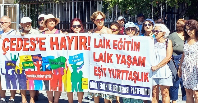 İzmir'de Dikili Emek ve Demokrasi Platformu, 2023-2024 eğitim öğretimin yılının başladığı ilk gün “Laik eğitim, laik yaşam için ÇEDES’e hayır” diyerek, İlçe Milli Eğitim Müdürlüğü önünde basın açıklaması düzenledi.