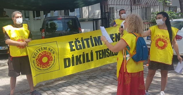 İzmir’in Dikili İlçesi’nde Eğitim-Sen tarafından Covid-19 salgını nedeniyle seminerlerin online yapılmasına ilişkin basın açıklaması yapıldı. Basın açıklamasında; "1 milyon öğretmenin yaşamı tehlikeye atılmamalı ve yılsonu mesleki çalışma programı uzaktan yapılmalıdır" denildi.