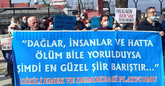 Dikili Emek ve Demokrasi Platformu tarafından düzenlenen basın açıklamasında; "Dağlar, insanlar ve hatta ölüm bile yorulduysa şimdi en güzel şiir barıştır" yazılı pankart ile "Yaşasın halkların kardeşliği", "Halkların iradesine dokunma", "Savaşa, sömürüye, ırkçılığa hayır", "Yaşasın barış" ve "Ülkede barış, bölgede barış" yazılı pankartlar açıldı.