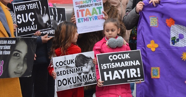 Basın açıklaması öncesi, “Çocuklarımızı Karanlığa Teslim Etmeyeceğiz” pankartı ile “Çocuk bedenime dokunma”, “Çocuk İstismarına hayır”, “Çocuk cinayetleri politiktir”, “Rabia Naz’ın sesiyiz”, “Susmuyoruz, korkmuyoruz, itaat etmiyoruz” yazılı dövizler açıldı. “İstismarı aklama suça ortak olma”, “Çocuk Susmaz Sen De susma”, “O yasa meclisten geçmeyecek”, “Tecavüzü aklama suça ortak olma”, “AKP elini çocuklardan çek”, “Biz çocuklarımıza güvenli ve istismarsız gelecek bırakacağız ya siz?” sloganları atıldı.