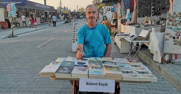 Keçik, mesai saatlerinin dışında Dikili sahilinde açtığı sergide kitaplarını okuyucu ile buluşturuyor.