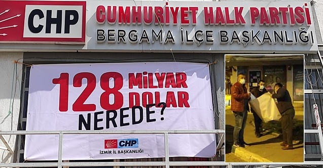 CHP Bergama İlçe Başkanlığı'nın sosyal medya üzerinden yaptığı açıklamada; “Hiç bir suç unsuru taşımayan ve ‘128 milyar dolar nerede?’ sorusunu içeren pankartımız İzmir Valiliği’nin talimatı ve kolluk kuvvetlerinin marifetiyle indiriliyor. Fakirin, fukaranın, yetimin hakkı için sormaya devam edeceğiz” sözlerine yer verildi.