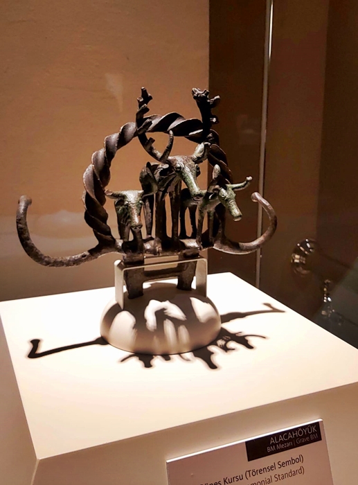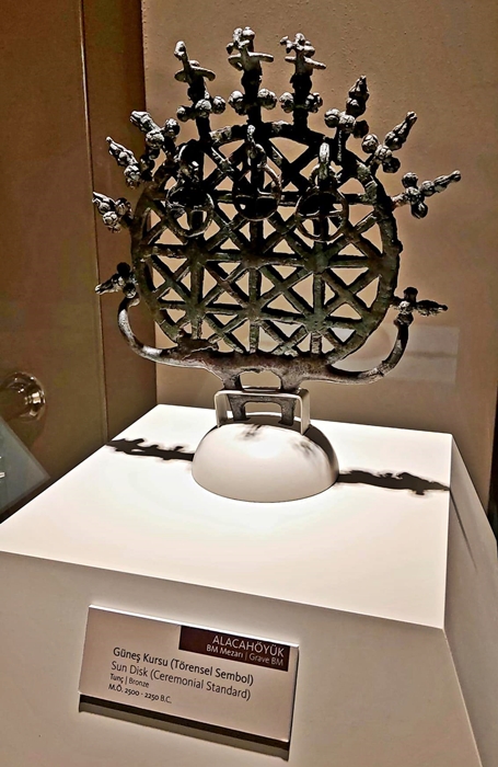 2. Güneş Kursu: Bugün Ankara Üniversitesi logosu olarak kullanılan bu tunç eser ve onu Hitit uygarlığının ve sanatının simgesi olarak kabul edebiliriz. Güneşi sembolize eden bir çember ve onun üst tarafına yerleştirilmiş kuş ve ağaç figürleri bulunmaktadır. Hemen çemberin alt tarafında üç tane çıngırak var. Dinsel törenlerde veya festivallerde bir asanın ucuna takılan Güneş Kursu, sallandıkça ritmik ses çıkarırmış. Hititleri Hatti’lerden ayrı tutmuyorum. İki ayrı halk tek medeniyette buluşmuş. O döneme ait pek çok eser, Çorum Alacahöyük Hatti ve Hitit kral mezarlarında bulunmuştur.