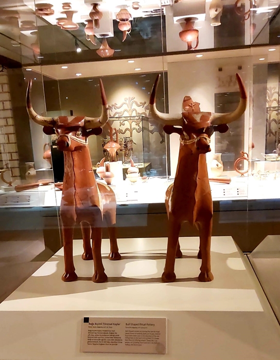 4. Boğa Küpler: Boğa şeklinde Kutsal Küpler, törenlerde kutsal sıvıyı sunmak için kullanılırmış. Kutsal sıvıyı, boğa küplerin içine sırtlarındaki deliklerden aktarılırmış. Burunlarındaki çifte deliklerle sıvının akması sağlanırmış. Bu muhteşem eserler Boğazköy’de bulunmuş ve M.Ö.16 yy'a aitler. Müthiş bir işçilik ve sırlanmaya sahip. Her iki boğa Fırtına tanrısı Teşup’un boğaları olarak, Hurri ve Şerri diye anılmaktadırlar.