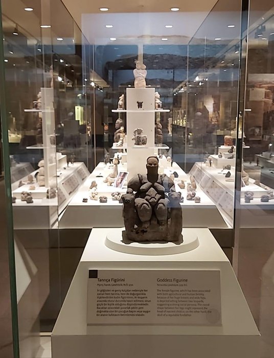 1. Kadın Heykelciği: Hemen müzenin girişinde ilk camekânın içinde yarı pişmiş bir kadın heykelciği sergilenmektedir. İri yarı bir kadın, leopar başlıklı bir koltukta oturmaktadır. Bir doğum sahnesi sunulmuş. Hocalarımız bu eserin Anadolu’nun ana tanrıçası Kibele’nin figürü olduğunu söylemişlerdi. Benim için çarpıcı bir eser olduğu için seçtiklerimin arasında ilk sıraya koydum.