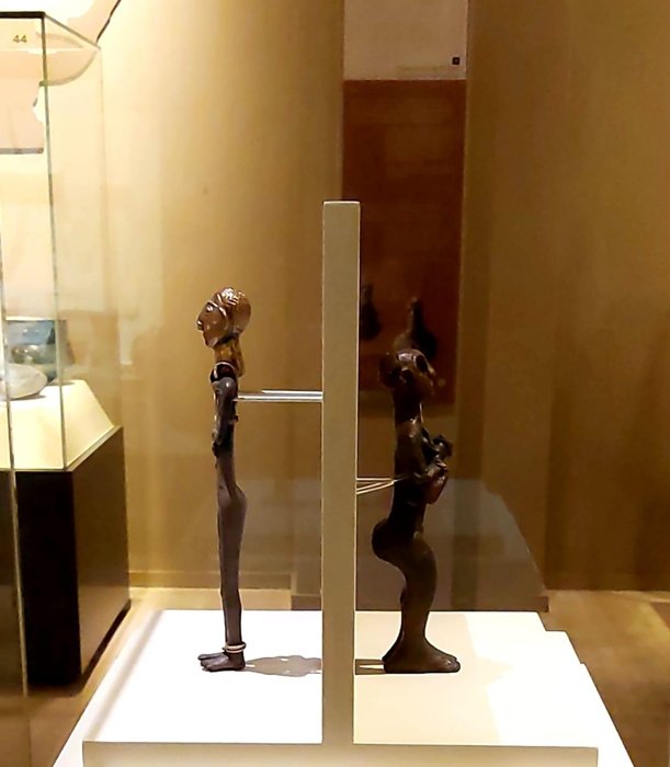 6. Emziren kadın heykeli: Horoztepe M.Ö.3 binden tunç bir heykelcik. Çocuğunun sol göğsünden emziren kadın sağ eliyle de evladının bacağını tutmuş. Aynı camekân içinde bir ikinci kadın tunç heykeli olduğu için her ikisini birlikte çekmek için yan taraftan görüntüledim.