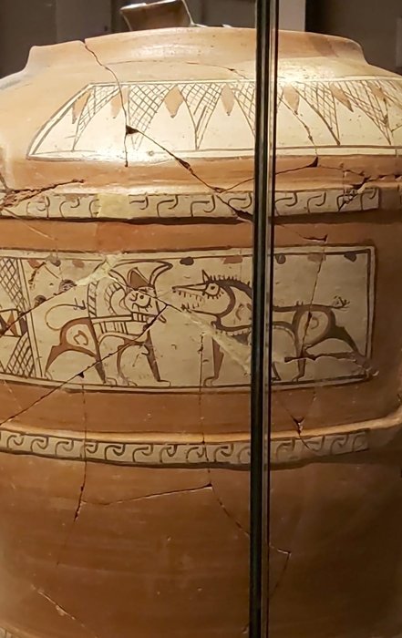 9. Bir Frig Küp daha: Sanatçı bu değerli küpü yaratmış iyi incelenirse üzerinde bir av sahnesi sunulmuş. O kadar ince bir detay var ki hayretler içinde kalıyorsunuz. Detayları anlatmak istiyorum. İki hayvan karşı karşıya sunulmuş. Birincisi avına kitlenmiş bir aslan olmalıdır. Karşıdaki domuz olabilir. Aslan kendini avının üzerine atlayacakmış gibi vaziyet almış, gözünü onun üzerine dikmiş, bacaklarını tam siper almış. Karşısında Zavallı bir hayvancık, savunmaya geçmiş, gözüne dikkatli bakınca üzüntülü bir halde kaderini bekler vaziyette duruyor. Bana bu sahnedeki duyguları veren bu sanatçıyı kutluyorum.3500 yıl öce böyle bir sanatçı Frig- Hitit çömlekçilik ve resim sanatının ne kadar güçlü olduğunu gösteriyor.