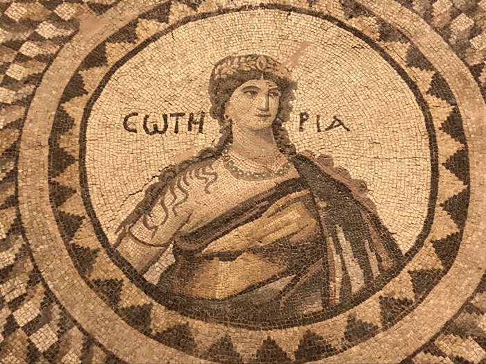 Apolausis (Zevk, Sefa) Hamamı (Soteria-Sağlık mozaiği) (İS 400), Hatay Arkeoloji Müzesi'ndedir (env. no. 977, kazı no. 5287-M82A).