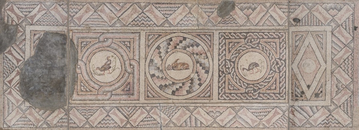 Fotoğraf 5. Apolausis Hamamı, Soteria mozaiği (Sağlık). Üzüm yiyen bir tavşanın yanında gagalayan kuşları... https://artifactsdiscovery.com/details/4476/