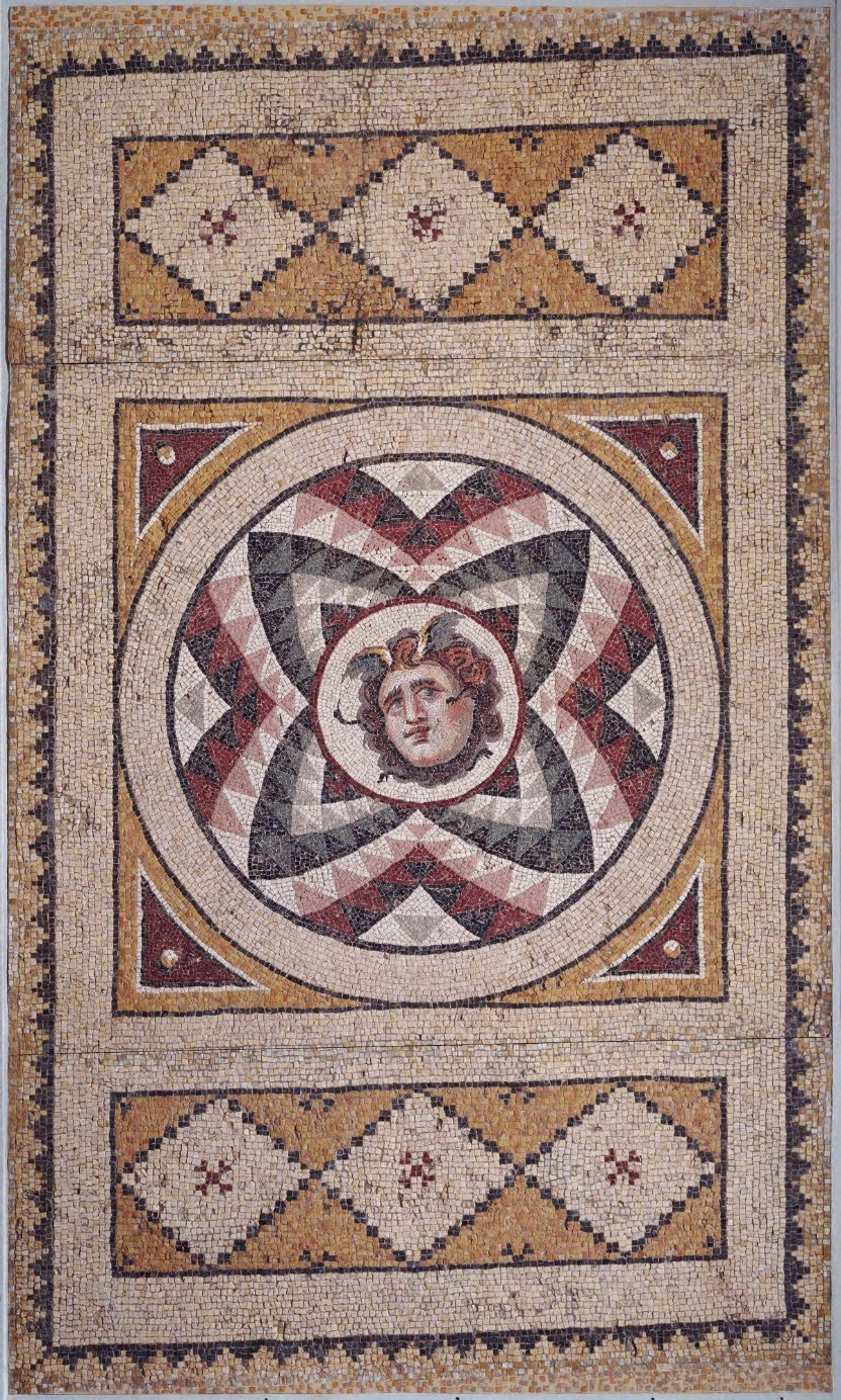 Footğraf 38. Mozaik döşeme: Medusa başı, İS 2. Yy sonları. 1965-212. Boyut: 331.0 x 197.4 cm. Antakya, Defne. https://artmuseum.princeton.edu/collections/objects/29576