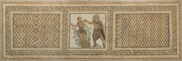 Fotoğraf 36. Roma, Asi Antakyası, Menander Evi: Apollon ve Daphne, MS 3. yy sonları. Mozaik döşeme, boyut: 190 cm, 592cm. Antakya Kazı Komitesi'nin Princeton Üniversitesi'ne hediyesi. Fotoğraf: Bruce M. White. https://artmuseum.princeton.edu/story/antioch-through-ages. Princeton University Art Museum Princeton, NJ 08544