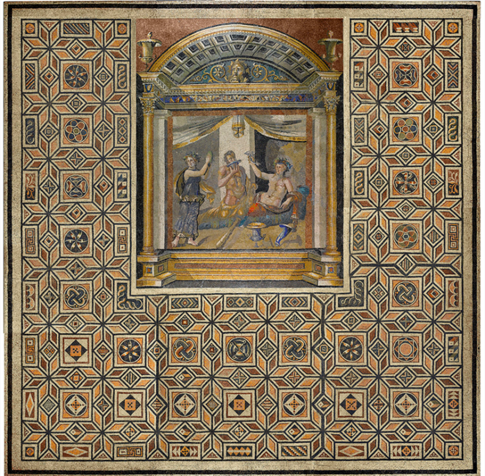 Fotoğraf 37. Mozaik papel: Herakles ile Dionysos'un içki içme yarışması, M.S. 3. yüzyılın başı. y1965-216. Boyut: 526.0 x 527.0 cm, figüral alan: 229.2 x 295.5 cm Antioch mosaics. Princeton University Art Museum. https://artmuseum.princeton.edu/search/collections?mainSearch=%22Antioch+mosaics%22