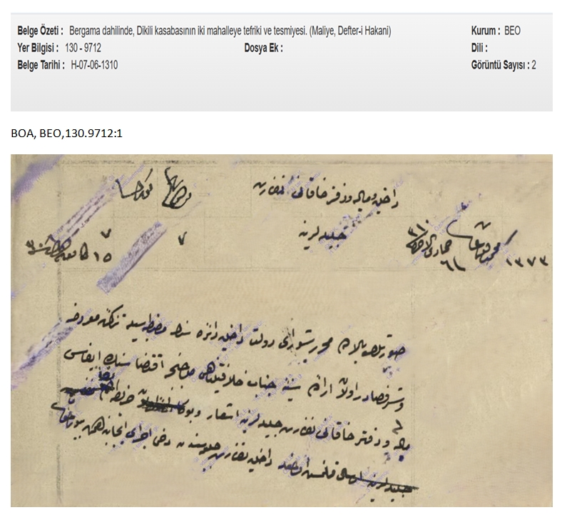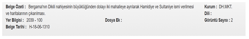 Bergama kazasına muzâf Dikili kasabasına cesametinden nâşî bir mahalle şeklinde idaresi mucib-i müşkilat olmakda olduğundan kasaba-yı mezkurenin teshil-i idaresi içün iki mahalleye taksimiyle birinin nâm-ı nâmî hazret-i hilafetpenahiye mensuben Hamidiye ve diğerinin Sultaniye tesmiyesi ve … müteferri-i sairesinin icrası hususu şura-yı devlet kararıyla bi’l-istizan irade-i seniyye hazret-i hilafetpenahiye müteallik ve şeref-südûr buyrularak icabı icra kılınmış olmağla bir mantûk emr-u ferman-ı hümâyun iktizasının ifası seraskere ve mahalinden tanzim ve irsal olunan harita leffen takdim olunmuş olmağla ol babda divan-ı hümâyun beğlikciliği canibi olan muamele-i lazım-ı ifa olunmak üzere sicil-i nüfus idare-i umumiyesine işbu tezkere ita kılındı.