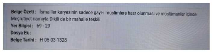 Dâhiliye nezaretinden şûra-yı devlete buyurulan 11 Safer 1329 tarihiyle ve 2/4029 numrolu tezkiresi ve melfufatı mülkiye dairesinde kırâat olunan mezkûr tezkire mealinde Bergamanın Dikili nahiyesine tâbi İsmailler karyesinde mukaddema iskân idilmiş olan Rum ili muhacirleri oranın âb ve havasıyla imtizac idemeyerek Dikili’ye nakl hane itmiş ve elyevm mezkûr karyede İslam ailesi kalmamış olduğundan ve karyenin ihtiyar heyeti Dikilide ifa-yı vazife itmekde bulunduğundan bahş ile muamele-i askeriyece teşvişatı mucib olmamak üzere karye-i mezkurenin elyevm mütevettin olan nüfus-u gayr-ı müslimeye hasrı ve İslamiler içün de Dikili nahiyesi merkezinde bi’l-istizan makrun-ı müsaade-i seniyye hazret-i padşahiye buyrulduğu halde ifâ-yı muktezasının taraf-ı vilayete li-ecli't-tebliğ dâhiliye nezaretine havalesi ve icab iden diğer devâire ma’lumat-ı itası tezkire kılındı olbabda emr-u ferman hazret-i men lehü'l-emrindir.