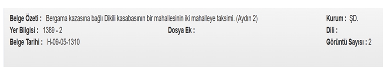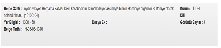 Aydın vilayeti dâhilinde Bergama kazasına muzâf Dikili kasabasının cesametinden nâşî bir mahalle şeklinde idaresi mucib-i müşkilat olmakda olduğundan kasaba-yı mezkurenin teshil-i idaresi içün iki mahalleye taksimiyle birinin nâm-ı nâmî hazret-i hazreti hilafetpenahiye mensuben Hamidiye diğerinin ise Sultaniye tesmiyesi ve ma’l-i muteferri-i sairesinin icrası tezkire kılındığına dair şura-yı devlet dâhiliye idaresine mazbatası melfufiyle arz ve takdim kılınmış olmağla bir mucib mazbata ifâ-yı muktezası hususuna her ne vech ile irade-i seniyye cenab-ı padşahiye şeref-sünûh ve sudûr buyurulur ise mantûk-ı munifi infâz idileceği beyanıyla tezkire-i senâ-verî terkim kılındı efendim.