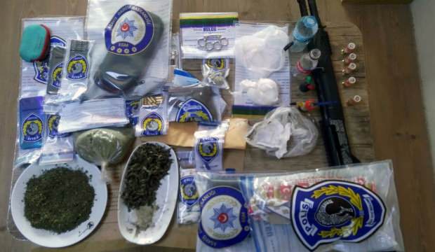 Yapılan aramalarda yaklaşık 100 gram sentetik uyuşturucu, 100 gram esrar, tabanca, pompalı tüfek ile hassas terazi ele geçirildi.