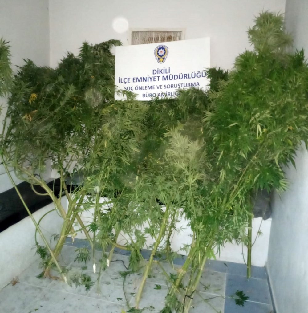 Dikili'de uyuşturucu ile mücadele kapsamında düzenlenen operasyonlarda 86.13 gram kurutulmuş Hint keneviri bitkisi ve 31 kök ekili Hint keneviri bitkisi ele geçirildi.