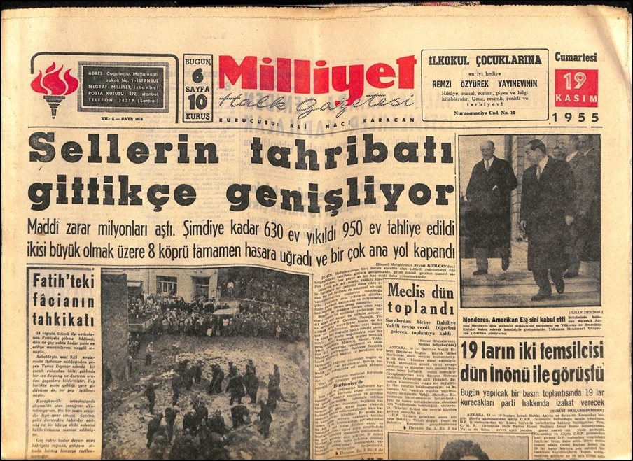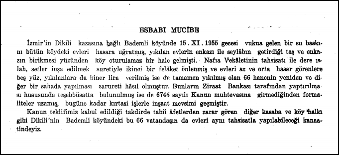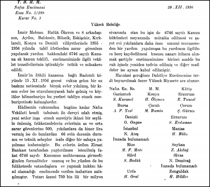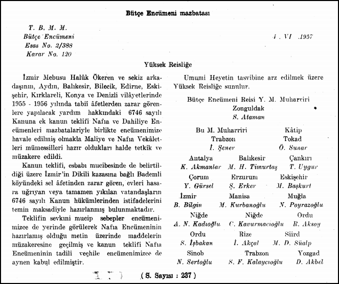TBMM kayıtlarına göre; 29 Aralık 1956’da ve 4 Haziran 1957 yıllarında bütçe görüşmelerinde başta İzmir Milletvekili Haluk Ökeren olmak üzere bazı milletvekillerinin yaşanan sel felaketlerinde evleri hasar görenlere maddi yardım önerisi getirilmiş. Ancak bir sonuç alınamamıştı.