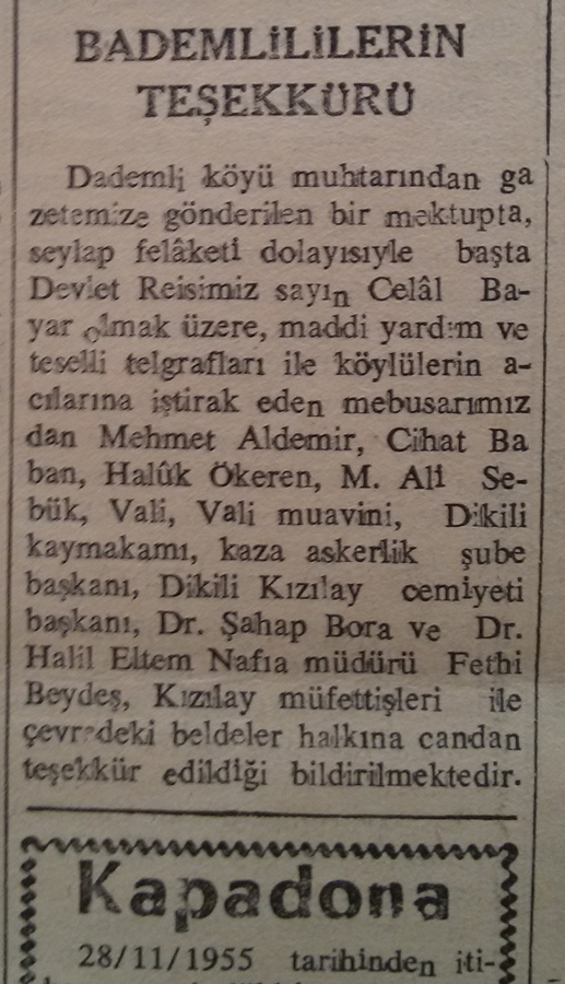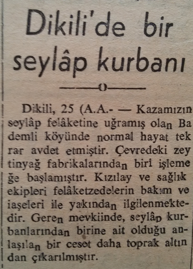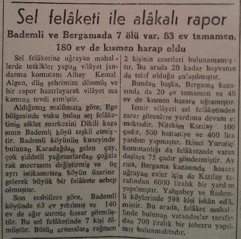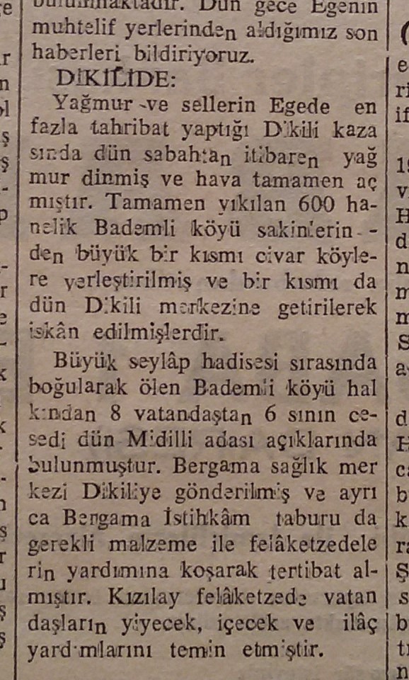 Perihan Elibol (Doğ. 1921): Köyün ebesiydim ben. Selin olduğu gece asla unutamayacağım bir olaydır. Bizim ev sağlamdı, komşular bize geldiler. Ama bizim evinde zarar göreceğini düşündük ayrıldık ordan. Daha güvenli bir yere gitme kararı aldık. Herkes panik halindeydi. Gece geç saatlerdi. Kalaslar konuldu. Halil Güdem’i hatırlıyorum, insanları sırtında geçirdi güvenli yerlere. Öyle öyle ilerledik okul bölgesine. Benim 2,5 aylık bebeğim vardı. Bebekler, çocuklar elden ele taşındı. Ben bir ara bebeğimi gözden kaçırdım. Korkunçtu o an. Sonra okula vardığımızda ordaydı kızım Güldem. Islaktı herkes, sobalar yakıldı. Isınmaya çalışıldı, sağlam evlerden yiyecek getirildi, elbiseler getirdiler. Yol zarar görmüştü. Karadan birkaç gün Bademli’ye ulaşım sağlanamadı, sağlandıysa da çok zor. Deniz yolu açıktı. Biz okulun yakınından bir yerden sabah sandala bindik, öyle Dikili’ye götürdüler. Sandaldayken denizin yüzeyinde çeyizler, yorganlar, insanların özel eşyaları vardı. Bu manzaraya çok üzüldüm. Dikili’ye vardığımızda üzerimdeki manto çamur içindeydi, kucağımda bebeğim, ağlıyordum bir yandan. Bunu gören Dikilili vatandaşlar, ‘Ebe hanımın büyük kızını (Çiğdem) sel aldı’ diye yorumlamışlardı. Hâlbuki büyük kızım Dikili dışında dayısının yanındaydı. Birkaç gün sonra eşyalarımızı almaya gittik, iş kamyonun arkasında. Köy tanınmıcak haldeydi. (2013 yılında yapılan röportaj)