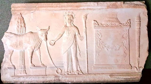 Merdivenlerden çıkıp ana binaya girişten sola dönünce duvarda Demeter kabartması bulunmaktadır. Akropolde Demeter kutsal alanında bulunmuştur. Sanki bir lahitin ön yüzü gibi görülüyorsa da aslında onunla korkuluk duvarı kaplanmıştır. Mermer kabartmanın ortasında, Bereket Tanrıçası Demeter, elinde Phiale adı verilen bir kabı tutmaktadır. Sağ tarafında, üzerinde kutsal ateşin yandığı altar bulunuyor. Sol tarafında ise kendisi için kurban edilecek bir boğa yer almaktadır.