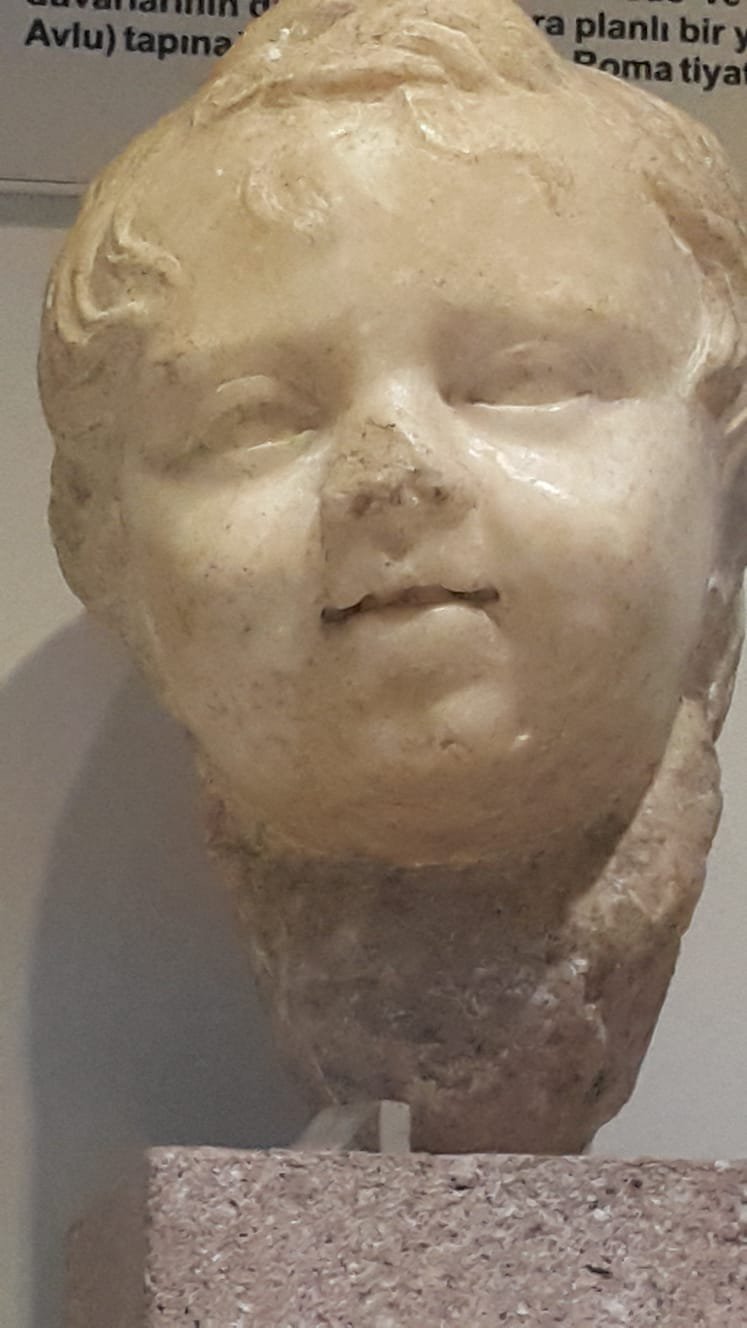 Müzenin ikinci bölümünün orta camekânında gülen çocuk Eros bulunmaktadır. Benim en favori eserimdir. İşlenilen mermer rengi itibariyle de çok özel. Heykeltıraş o kadar özenli bir işçilik sunmuş ki, yüzdeki o gülüş, tebessüm, yanaklardaki aydınlık, saçlardaki o tarama müthiş. Size bir öneride bulunacağım. Müze ziyaretinizde bu Eroslu camekânın önüne geldiğinizde, Eros başının önünde sağ dizinizi yere koyun ve başınızı aşağı eğip gülen çocuğun dudaklarının arasına bakın... Dudakların arasındaki dişlerini görünce bu eseri ortaya koyan sanatçıyı alnından öpmek istiyorsunuz. Yani, sanatçı dudakların altına iki ön dişini de koymayı unutmamış. Buna şapka çıkarılır derim.