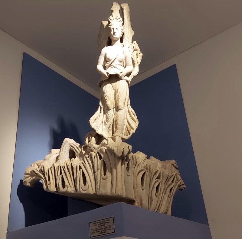 Müzede zafer tanrıçası Nike heykeli, iki tane bulunmaktadır. Birincisi Helenistik dönem den ikincisi de Roma dönemindendir. Sizin için seçtiğim Nike heykeli roma döneminden olan. Asklepeion’da Asklepios Kutsal alanı akroter denilen köşe kısmında kullanılmış ve kazılarda orada bulunmuştur. Bu heykel mermerden 1,19 metre yüksekliğinde Roma Dönemi 2. yüzyıla ait bir değerli eserdir. Her dönem Nike heykelleri, rölyefleri, hep kanatlı sunulmuştur. Bu heykel de kanatlı yapılmış, sanki gökyüzünden yeryüzüne uçarak iniyormuş gibi tasvir edilmiştir. Aslında o mitolojide Okeanos’un kızı, Athena’nın yakın arkadaşı ve kanatlı hızlı uçan bir kız olarak sunulur. Salonun köşesinde yukarıda bir kaideye konmuştur.