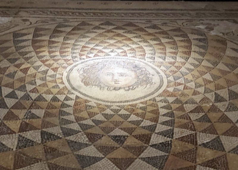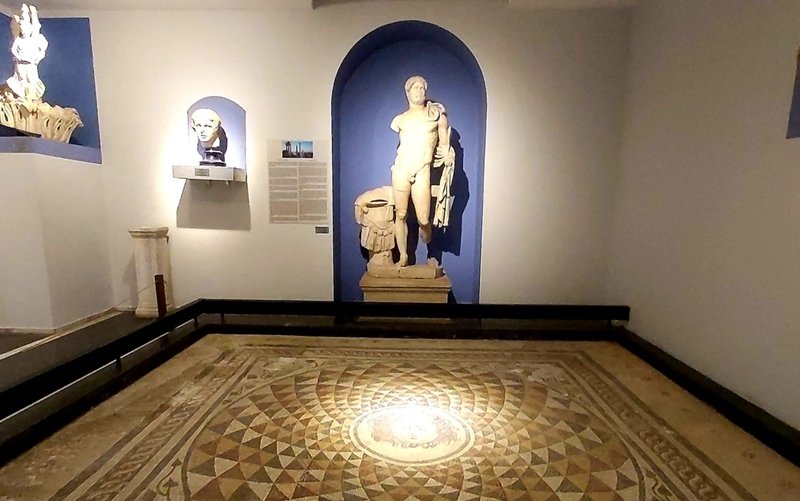 İmparator Hadrianus heykelinin önündeki zemini bir renkli mozaik süslemektedir. Merkezinde Medusa'nın başı yer almakta ve saçları yılanlarla çevrilmiş haldedir.