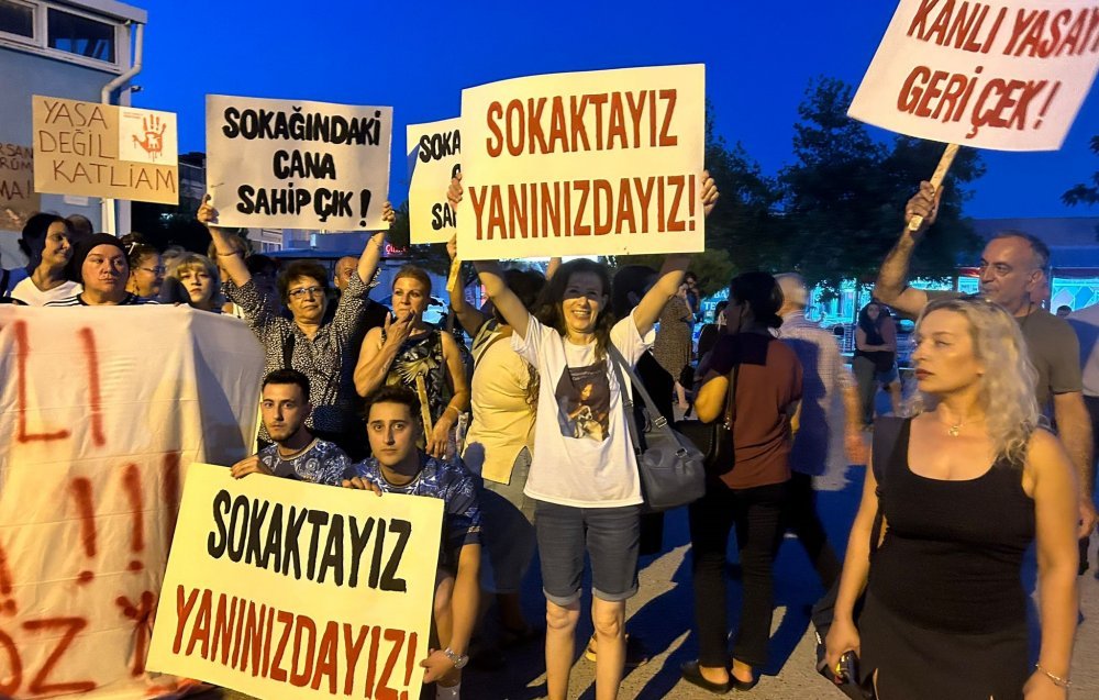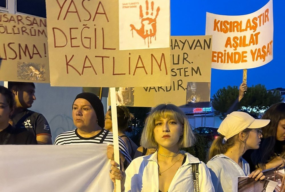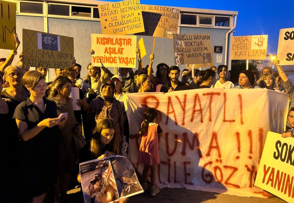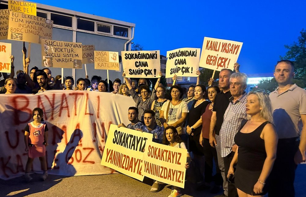 Bayatlı Sitesi önünde buluşan vatandaşlar tarafından “Kısırlaştır, aşılat, yerinde yaşat”, “Kanlı yasayı geri çek”, “Sokaktaki cana sahip çık”, “Yasa değil katliam”, Suçlu hayvan yoktur, suçlu sistem vardır”, “Katliama dur de”, “Susma haykır, katliama hayır”, “Yaşam ve özgürlük haktır” ve “Köpekler değil, katiller uyutulsun” yazılı dövizler açıldı.