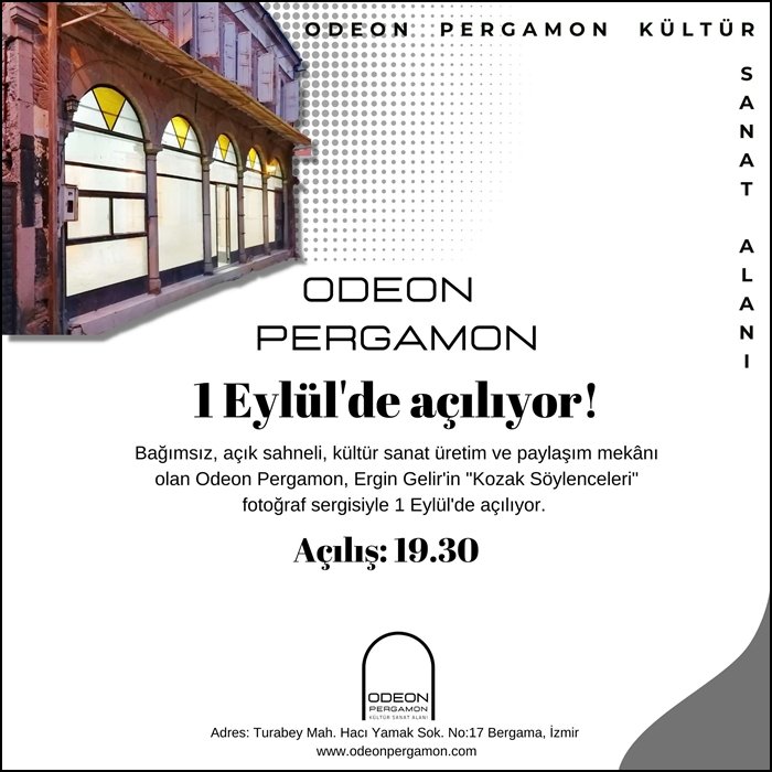 -Odeon Pergamon, 1 Eylül’de, Kozaklı gazeteci ve fotoğrafçı Ergin Gelir’in Kozak Söylenceleri adlı fotoğraf sergisi ile kapılarını açacak. Bu serginin devam ettiği günler içerisinde Kozak Yaylası’nda yaşanan doğa talanına, ekolojik tahribata ilişkin panellerimiz, çocuklarla ve gençlerle yapacağımız ekoloji odaklı psiko-drama çalışmalarımız olacak.