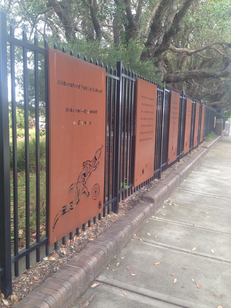 Okulun önündeki çitlere, demir üzerine oyma tekniği ile yazılmış ve aborjin desenleri ile süslenmiş panolar yerleştirilmiş.