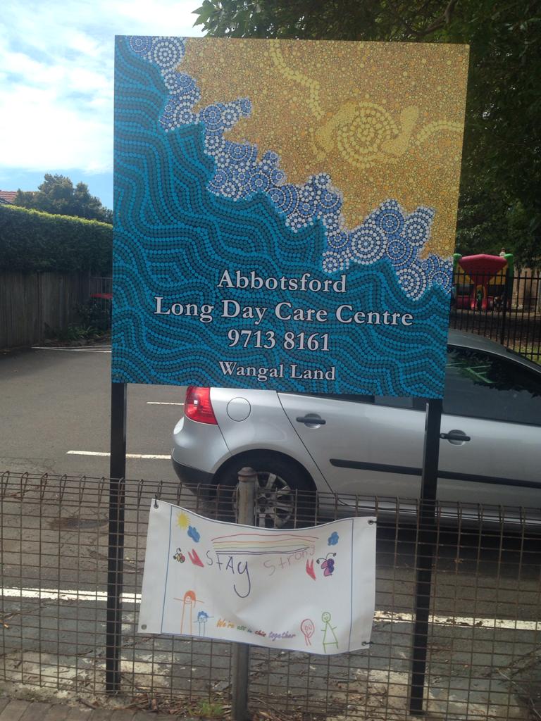 'okul sonrası bakım merkezi' tabelası aborjin desenleri ile süslenirken,