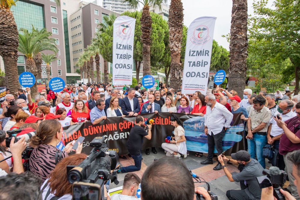 İzmir Barosu Başkanı Özkan Yücel de, “Bugün burada Türkiye’nin hasret kaldığı bir ilke şahitlik ediyoruz. İzmir’den bir sivil itaatsizlik hareketi başlattık. Bu çağrı Türkiye’ye ilişkindi. Bugün burada bütün Türkiye’yi temsil eder biçimde meslek örgütü temsilcileri ve sendika başkanları burada aynı çağrıya, aynı talebe ortaklık ediyorlar. Bir taraftan sokağı, bir taraftan mahkemeleri onlara dar etmeye kararlıyız. Her yolu deniyoruz. Bunlardan biri mahkeme. Yarın bu mahkemeden yürütmeyi durdurma kararı çıkmazsa denizleri de onlara dar etmeye kararlıyız. Hatırlatalım. Onlar da İzmir’de yaşıyorlar İzmir’in zehirlenmesine izin vermemek kendileri için de gerekli bir şey. Gecikmeden karar verilmesi gerekir, savunma hadi alınmadan yürütmenin durdurulması kararı verilmesini istiyoruz” ifadelerini kullandı.