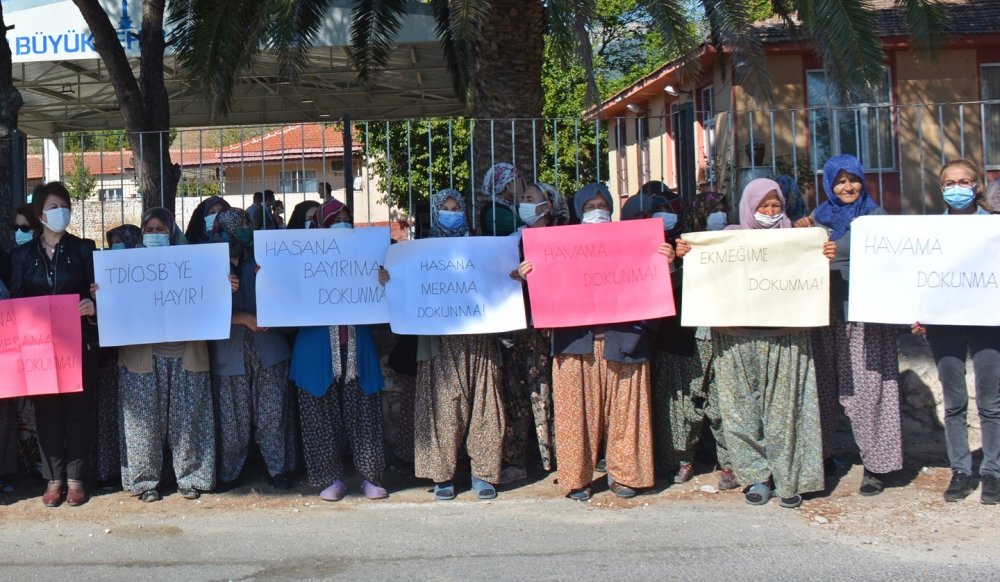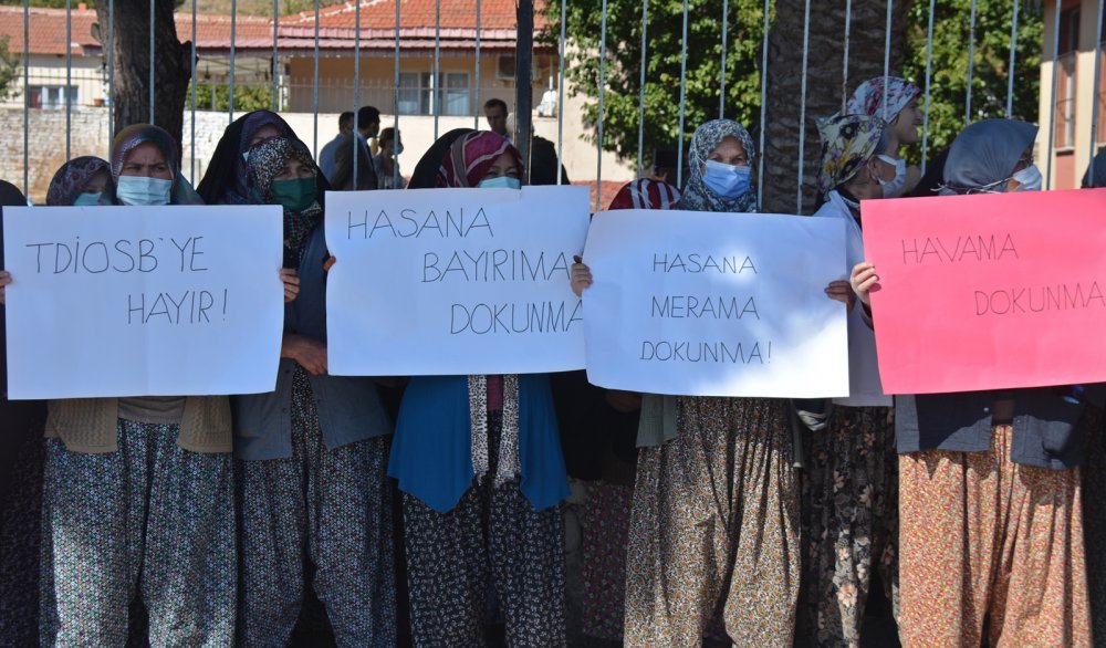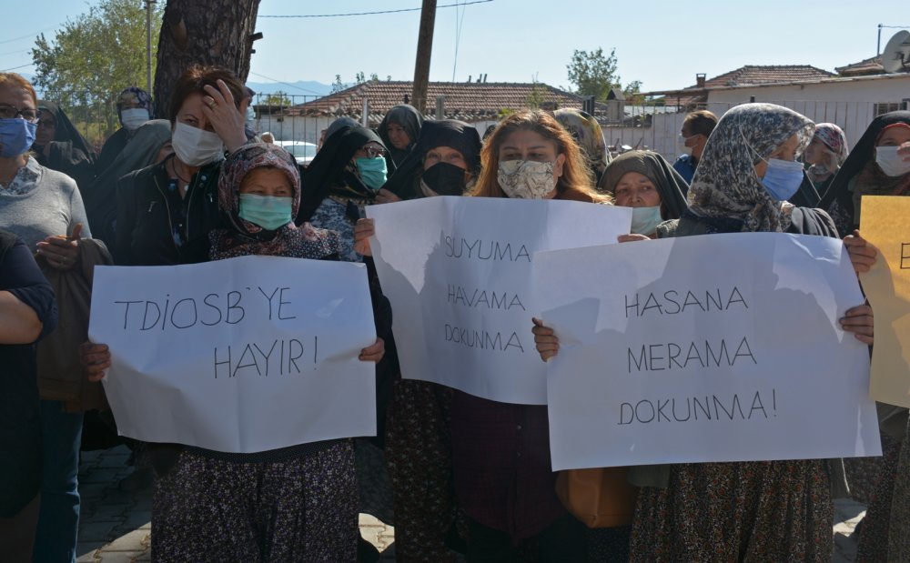 Alibeyli kadınları toplantıya ellerinde “Havama dokunma”, “Suyuma dokunma”, “Hasana Merama dokunma”, “TDİOSB’ye Hayır”, “Ekolojik sistemimi bozma!” dövizleriyle katıldılar. Alkışlar eşliğinde “istemiyoruz” sloganı attılar.