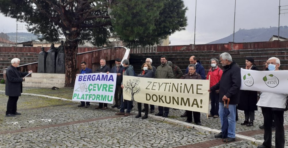 Bergama'da Maden Yönetmeliği’nde yapılan değişiklikle zeytinlik alanların maden sahalarına açılmasına karşı basın açıklaması düzenledi.