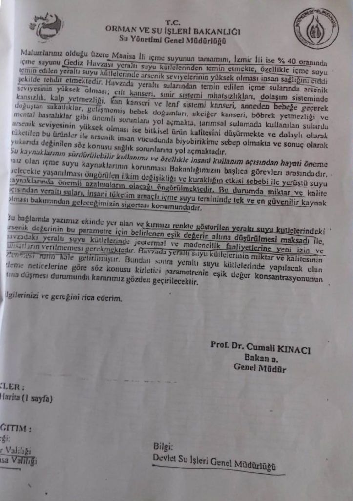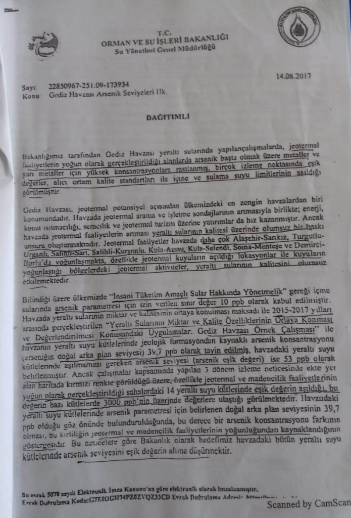 “Orman ve Su İşleri Bakanlığı Su Yönetimi Genel Müdürlüğü tarafından İzmir ve Manisa Valiliklerine 14 Ağustos 2017 tarihinde gönderdiği yazı ile Gediz Havzası yeraltı sularında yapılan çalışmalarda jeotermal faaliyetlerin yoğun olarak gerçekleştirildiği alanlarda arsenik başta olmak üzere metal ve yarı metal oranlarının içme/kullanma sularında limitlerin çok üstünde olduğu belirtildi. Ülkemizde İnsani Tüketim Amaçlı Sular Hakkında Yönetmelik gereği içme sularında arsenik sınır değerinin 10 ppb’den büyük olmaması gerekiyor. Ancak ilgili yazıda Gediz Havzası’nda 2015-2017 yılları arasında yapılan çalışmalarda yeraltı sularındaki arsenik oranının 39.7 ppb olarak tespit edildiği belirtiliyordu. Valiliklere gönderilen yazıda: ‘Çalışma kapsamında yapılan 3 dönem izleme neticesinde özellikle jeotermal ve madencilik faaliyetlerinin yoğun olarak gerçekleştirildiği sahalardaki 14 yeraltı suyu kütlesinde eşik değerin aşıldığı, bu değerin bazı kütlelerde 3000 ppb’nin üzerinde değerlere ulaştığı görülmektedir”. İfadesi yer alıyor. Bu kirliliğin kaynağının jeotermal ve madencilik faaliyetleri olduğunun altının çizilen yazı ile “havzadaki yeraltı suyu kütlelerinde jeotermal ve madencilik faaliyetlerine yeni izin ve ruhsatların verilmemesi gerekmektedir’ denilmişti.