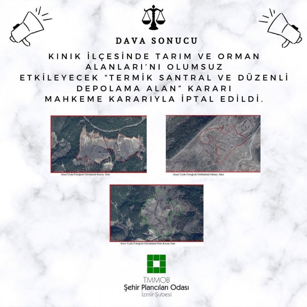 Şehir Plancıları Odasından yapılan açıklamada, “İzmir İli, Kınık ilçesinde, Termik Santral ve Düzenli Depolama Alanlarına ilişkin Çevre ve Şehircilik Bakanlığı tarafından 12.03.2018 tarihinde onaylanan 1/25.000 ölçekli Nazım İmar Planı Değişikliği, 1/5000 ölçekli Nazım İmar Planı ve 1/1000 ölçekli Uygulama İmar Planına meslek odamız tarafından dava açılmıştır. İzmir 6.İdare Mahkemesi’nin 2018/883 E., 2020/923 K. sayılı kararı ile; dava konusu plan kararları ve önerilen arazi kullanım kararlarının; planlama alanı ve çevresine ilişkin doğal yapı özellikleri kapsamı, doğal yapı üzerindeki olası çevresel etkileri, yer seçim ilkeleri (özel ürün arazilerinin tarımsal niteliği ve bütünlüğünün olumsuz etkileneceği, yeterli önlemlerin alınmamış olduğu), mevzuata (5403 sayılı Toprak Koruma ve Arazi Kullanımı Kanunu, Atıkların Düzenli Depolanmasına Dair Yönetmelik hükümleri), üst ölçekli plan kararlarına uygun olmadığı gerekçeleriyle, söz konusu planlar iptal edilmiştir” bilgileri veridi.