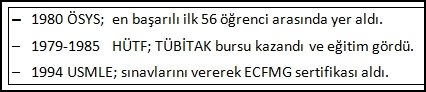 - Hacettepe Tıp Fakültesi eğitiminden geçmiş, Tıp Doktoru (1985), Üroloji Uzmanı olmuş (1992), ortaya koymuş olduğu bilimsel çalışmaları ile bu fakülteyi bitirenler arasında, içinde yaşadığı topluma ve ülkeye “değer” üreten, seçkin bir yer edinmiştir.