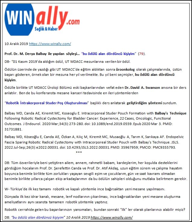 - Prof. Dr. M. Derya Balbay ile yapılan söyleşi. “Bu ödülü alan dördüncü kişiyim”. Winally Sağlık Haber. 10 Aralık 2019.
