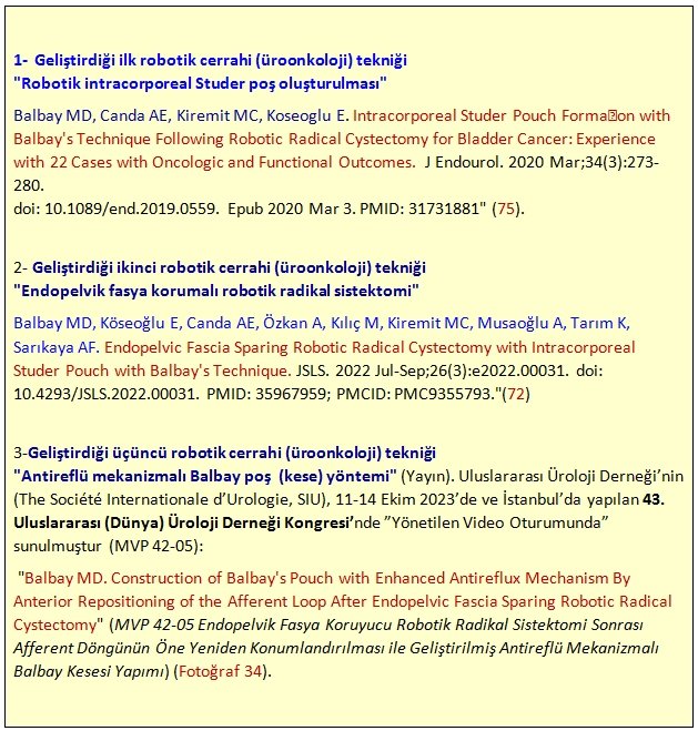 - Prof. Dr. M. Derya Balbay, özellikle “mesane kanseri için robotik radikal sistektomi sonrasında intrakorporeal Studer kesesi oluşumu” üzerine, “literatürde” kabul gören kendi tekniğini (Balbay Yöntemi) geliştirmiştir (Endourol. 2020 Mart;34(3):273-280). Şimdiye dek Robotik Üroonkoloji alanında 3 yeni teknik geliştirmiştir (Tablo VI).