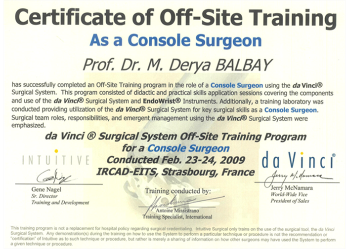 - Prof. Dr. M. Derya Balbay, Uluslararası düzeyde yapmış olduğu yenilikçi:“innovative”, “inventive” çalışmalarla, robotik üroonkoloji alanındaki teknolojinin gelişmesine katkıda bulunmuş, katıldığı bilimsel toplantılarda ve forumlarda Türkiye’yi en iyi biçimde temsil etme becerisi göstermiştir.