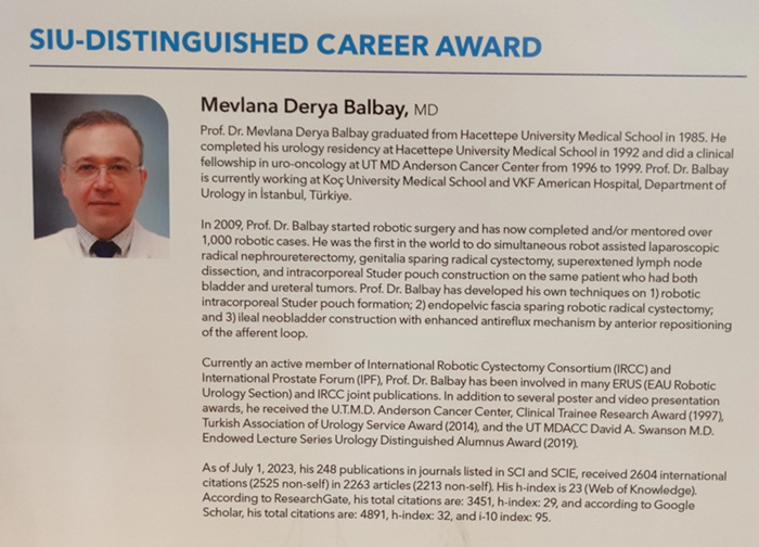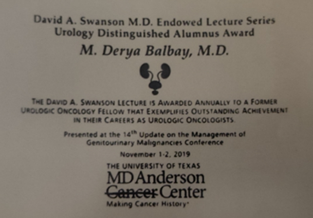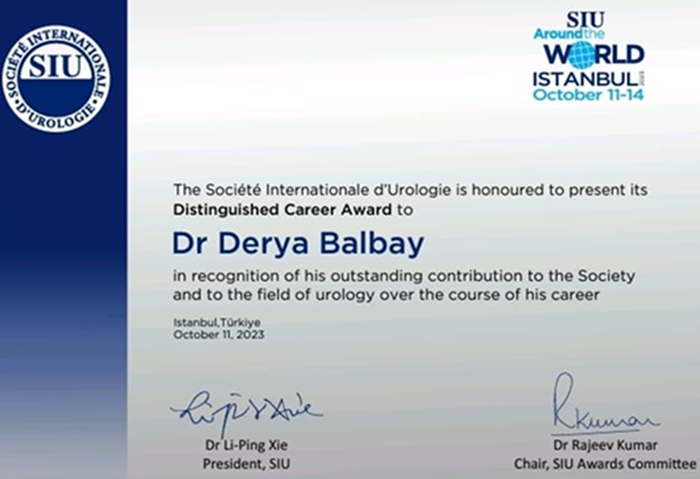 - Prof. Dr. M. Derya Balbay, bu çalışmalarından ötürü, uluslararası ödüller almış, son olarak, 2023 yılı SIU Seçkin Kariyer Ödülü”, Uluslararası Üroloji Derneği (Societe Internationale de’Urologie) tarafından, İstanbul’da yapılan toplantıda kendisine verilmiştir.