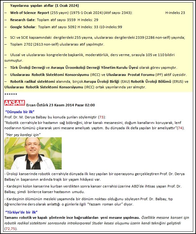 Bu bağlamda olmak üzere, Türkiye’de üroonkoloji ve robotik üroonkoloji alanında öncülük yapmış olan, genç bilim insanlarından birisinin de Prof. Dr. M. Derya Balbay olduğu görülmektedir.