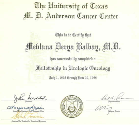 - ABD’ne giderek, önce USMLE (ECFMG) sınavını başarmış, sonra MD Anderson Kanser Merkezi’nde 3 yıl formal eğitim görerek Cerrahi Üroonkoloji Uzmanı (Clinical Fellow) olmuştur (1996-1999).