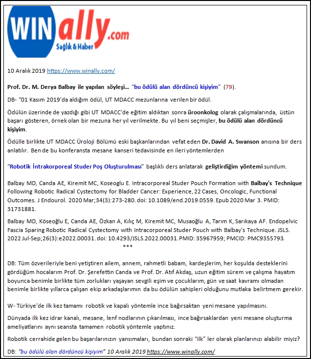 - Prof. Dr. M. Derya Balbay ile yapılan söyleşi. “Bu ödülü alan dördüncü kişiyim”. Winally Sağlık Haber. 10 Aralık 2019.